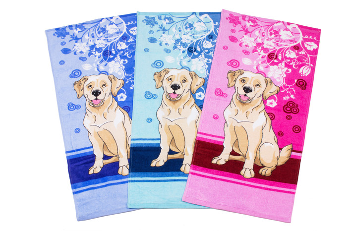 Полотенце махровое с набивным рисунком "Лабрадор".  Изделие производится на фабрике мирового уровня в Китае. Плотность - 330 гр/м2. При производстве используются только высококачественные устойчивые красители. Изделие выдерживает многократные стирки без потери яркости и мягкости. Лицевая сторона - велюр, изнаночная сторона - махра. Состав: 100% хлопок. Производство Sunvim Китай. В упаковке 3 полотенца одного размера (на выбор 25*50 см или 34*76 см) разных цветов. Цена указана за упаковку