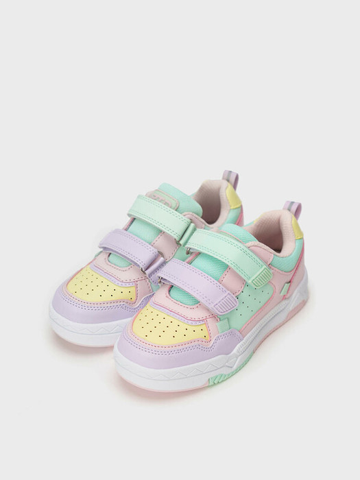 Трендовые детские кеды для девочки в стиле колор-блок. Кроссовки  выполнены из искусственной кожи, обладающей высокими эксплуатационными свойствами, и текстиля в качестве отделки. Профилированная съемная стелька из свиной кожи с анатомической формой подсводника обеспечивает правильную нагрузку на стопу. В носочной части обуви стоит текстильная подкладка c высоким содержанием хлопка 80%, которая обладает высокой гигроскопичностью. В пяточной части обуви текстильная подкладка обладает хорошей износостойкостью. Две липучки создают удобство при обувании и надежно фиксируют ногу. Формоустойчивый задник поддерживает стопу в правильном положении. Эргономичная форма колодки обеспечивает правильное формирование стопы ребенка. Подошва из ТПР не скользит и устойчива к истиранию.