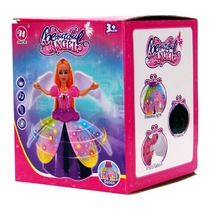 При включении кукла начинает двигаться в свободном направлении, кружиться, светиться разноцветными светодиодами, поднимаются и опускаются лепестки на платье.