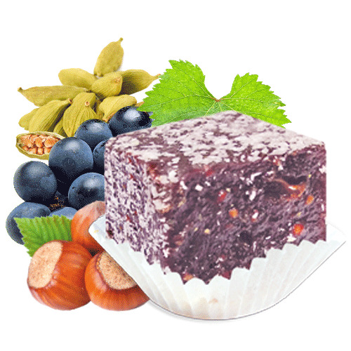 Состав: сок винограда, изюм, цикорий (пребиотик-инулин), крахмал кукурузный, крахмал гороховый, фундук, семя подсолнечника, кокос, кардамон, гвоздика, вода, красная рябина, агар-агар, стевия