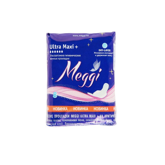 Мговенно впитывают и удерживают влагу. Ультратонкие гигиенические прокладки Meggi Ultra Maxi+ (Dry-layer). Верхний слой "Dry-layer" - это мягкая гипоаллергенная сеточка, которая быстро пропускает жидкость внутрь прокладки и остается сухой и чистой.