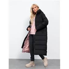 Длинный стильный пуховик прямого кроя с глубоким капюшоном.