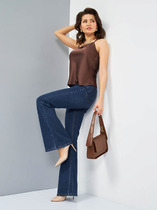 Женские джинсы с пятью карманами. Посадка Slim flare fit (облегающие по бедру и расклешенные от колена), высокая талия. Для улучшения посадки по талии сделан подкройной пояс из 2-х частей. Застежка на молнии. Выполнены из слабоэластичной ткани denim stretch, Средняя стирка со слабовыраженными потёртостями спереди и сзади. Параметры указаны для размера 28. Длина внутреннего шва - 83,0 см.