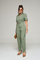 Комбинезон отрезной по линии талии с притачным поясом и съёмным завязывающимся поясом по линии талии. С застёжкой на потайную тесьму-молнию по среднему шву спинки. Лиф переда на запах и с рельефными швами. Лиф спинки с талевыми выточками и средним швом. Брюки полуприлегающие по талии и бёдрам и прямые книзу. По переду отлетные детали вставлены в боковые и по линии талии имитирующие платье. Передние и задние части с талевыми выточками.