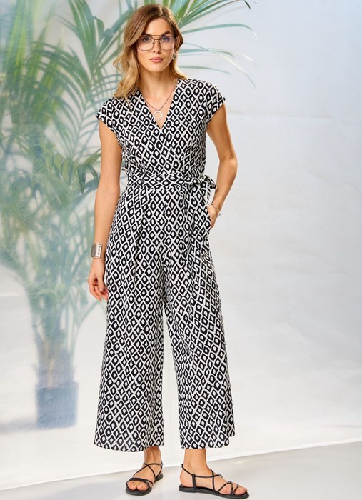 Комбинезон женский из штапеля, свободного силуэта, со спущенной линией плеча, с втачным поясом на уровне линии талии, с застежкой на потайную тесьму-молнию в левом боковом шве, с поясом, который по переду крепится на 2 пуговицы, по спинке протянут через 2 шлевки. Лиф детали переда комбинезона с запахом, на уровне талии обработаны 2 складки на лицо. На нижней части по шву притачивания пояса обработаны по одной складке на каждой половинке. Лиф детали спинки комбинезона со средним швом, вверху которого обработан разрез с застежкой на 1 навесную петлю и пуговицу, с талиевыми вытачками. На нижней части по шву притачивания пояса обработаны по одной вытачке на каждой половинке. В боковых швах обработаны карманы, и шлицы, на которых с каждой стороны прикреплены по 3 пуговицы. Вырез горловины комбинезона «V-образной» формы, обработан обтачкой. Длина спинки – 123см.