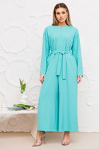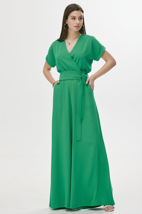 Стильный комбинезон полуприлегающего силуэта с расширенными книзу брюками из струящейся ткани. Комбинезон отрезной по линии талии на резинке, верхняя часть комбинезона на запах. По спинке в среднем шве центральная застежка на потайную молнию. В боковых швах карманы. Рукав цельнокроеный 5короткий на манжете. В комплект входит пояс из основной ткани.
