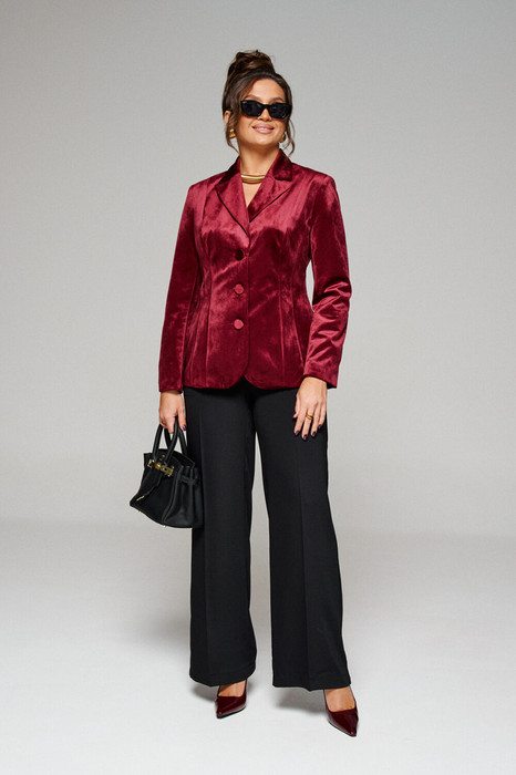 Жакет выполнен из бархатного полотна, элегантной и утонченной костюмной ткани, отличающейся дорогим и роскошным внешним видом.