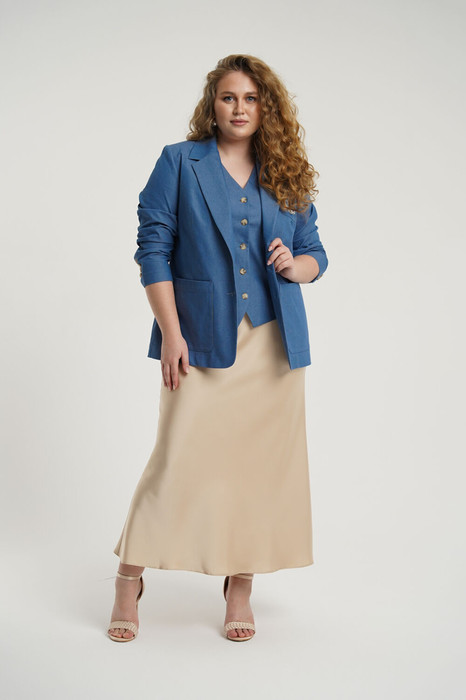 Комплект женский трехпредметный. Жакет из джинсовой ткани без подкладки полуприлегающий. Воротник пиджачного типа, застежка на петли и пуговицы. По переду накладные карманы, нагрудный карман декорирован вышивкой. Рукав втачной с шлицей и пуговицами. Жилет классический полуприлегающего силуэта на подкладке. Вырез горловины V-образный, застежка на петли и пуговицы. Спереди карманы с листочкой (обманки). Юбка из атласной ткани на подкладке, А-силуэта, по талии на резинке.