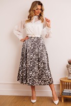 Жакет полуприлегающего силуэта, длинной ниже линии бедер.  Спинка с таллиевыми вытачками и средним швом.  Перед с нагрудными вытачками, переведенными в линии плечевого шва и накладными карманами. Жакет с центрально-бортовой застежкой на одну петлю-пуговицу и воротником пиджачного типа.