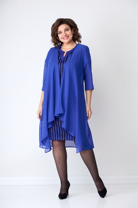 Комплект женский полуприлегающего силуэта из костюмно-плательной ткани. Комплект состоит из полуприлегающего платья и шифоновой накидки, которая надевается по верх платья. Перед платья двойной, выполнен из основной однотонной ткани и отделочной в полоску, перед с нагрудными выточками. По горловине из однотонной ткани выполнен декоративный элемент,отрезная фигурная планка, по верх планки клеится термо-аппликация из страз в цвет ткани. По спинке потайная молния переходящая в шлицу. Есть талевые выточки выгодно корректирующие фигуру.