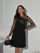 Платье женское выполнено из плательной струющейся ткани, свободного кроя, с плечевыми накладками, по горловине стойка, по низу пришит волан на сборке, платье можно носить как с поясом так и без пояса, Длина рукава 59 см, длина издеоия 105 см.