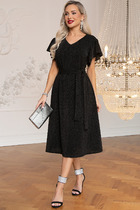 Платье прилегающего силуэта длиной ниже колена с сильным клешением книзу по форме квадрата. Рукав покроя реглан стандартное длины. Вырез горловины круглый с воротником стойкой. На спинке расположен декоративный вырез в форме капли.