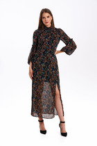 Платье макси комбинированное, двухцветное. Лиф ассиметричный по низу, с имитацией запаха, выполнен из костюмной ткани. Вырез горловины полукруглый, по спинке затежка на молнию. Рукава втачные, с манжетами и патами. Юбка на резинке, драпирующаяся, расширенного силуэта из плиссированного шифона. Изделие на подкладе.