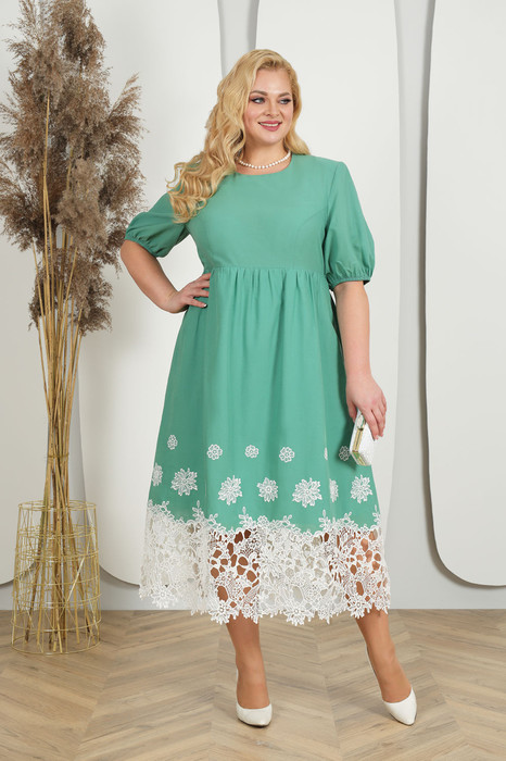 Платье женское полуприлегающего силуэта, расклешенное к низу, отрезное выше линии талии, выполнено из плательной ткани. Нижняя часть платья на подкладке. Длина платья по среднему шву спинки 124 см. Перед с рельефными швами, идущими от пройм до шва талии. Спинка со средним швом, с рельефными швами, идущими от пройм до шва талии. В левом боковом шве расположена застежка на потайную тесьму – молнию. Нижняя часть платья оформлена декоративным кружевом. Верхний срез талии переднего и заднего полотнища юбки со сборкой. Горловина переда и спинки округлой формы, углубленная по переду. Рукава втачные, одношовные, низ обработан на резинке. Длина рукавов 33 см. Платье с плечевыми накладками.