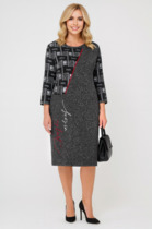 Платье женское, полуприлегающего силуэта, выполнено из гипюра и плательной ткани «сатин». Перед и спинка состоят из двух разных по длине слоев: нижний короче верхнего на 5 см. Модель без подкладки, с плечевыми накладками. Низ платья и рукавов оформлен фестонами. Перед в верхнем и нижнем слоях с нагрудными вытачками, выходящими из пройм. Спинка с талиевыми вытачками и средним швом, в верхней части которого обработана застежка на потайную тесьму-«молнию» (50см), в нижней – разрез. Вырез горловины переда и спинки округлый, углубленный по переду. Рукав короткий, втачной. Верхний и нижний слои платья скреплены по среднему шву, плечевым и проймам. Длина платья (верхний слой)-108 см, длина рукава-26 см.