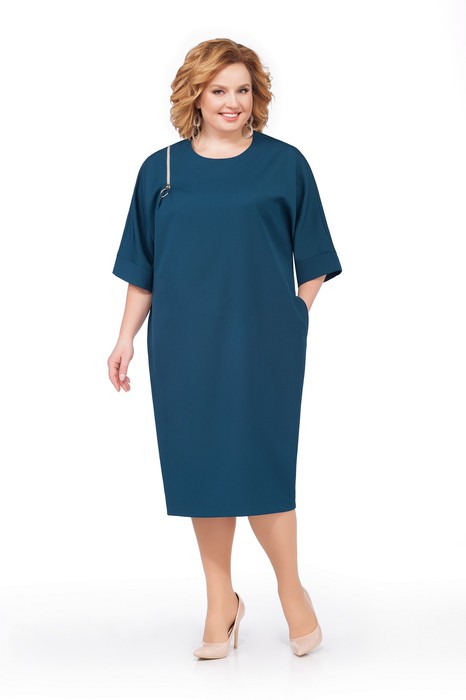 Платье свободного силуэта с цельновыкроенными рукавами вдлиной три четверти. Спереди обработана декоративная металлическая молния и складка. Рукава с притачными широкими манжетами. В боковых швах обработаны карманы. Спинка со средним швом, молнией и шлицей. Длина рукава – 39 см. Платье без подкладки. Длина- 115 см.