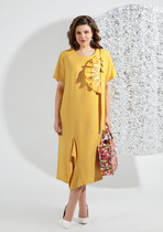 Платье женское относится к нарядной торжественной одежде. Платье полуприлегающего силуэта, с отлетной накидкой длиной за колено. Перед с двумя нагрудными вытачками, с двумя талиевыми вытачками. Спинка с двумя талиевыми вытачками и средним швом, заканчивающимся шлицей. Застежка на потайную тесьму-молнию в среднем шве спинки. Горловина круглая, обтачная, без воротника, по горловине закреплена накидка. Слева на уровне линии талии отделочным хлястиком, декорированным тесьмой накидка закрепляется на платье, нижняя часть накидки закреплена в левом боковом шве. Накидка с фигурным низом. Платье без рукавов. Длина спинки 103 см. Длина накидки от горловины 38 см