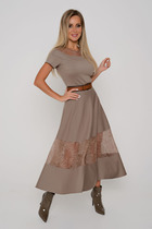 Платье предназначено для повседневной носки. Платье женское отрезное по линии талии, расширенное к низу, длиной до середины икры. Верхняя часть переда с 2-мя нагрудными вытачками, с притачной потайной вертикальной планкой. Верхняя часть спинки цельнокроеная. Горловина с V-образынм вырезом обтачная без воротника. Застёжка цельнокроеная бортовая на 11-ть навесных петель и 11-ть пришивных пуговиц. Нижняя часть переда с 2-мя односторонними складками и 1-ной встречной по центру. Нижняя часть спинки так же с 2-мя односторонними складками и 1-ной встречной по центру. Шов соединения верхней и нижней частей платья собраны на эластичную тесьму. Рукав втачной, одно шовный длиной за локоть. Окат рукава с лёгкой сборкой, низ рукава собран на эластичную тесьму. Платье на подкладке. Платье без плечевых накладок. К платью прилагается съёмный пояс. Длина спинки платья 116 см, длина рукава 37 см.
