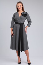 Трехъярусное платье из легкой струящейся ткани A-силуэта длиной миди. Рукав втачной, длиной 5/6, с фигурными отверстиями сбоку и с манжетой переходящей в бант. Вырез горловины v-образный. Платье на подкладке.