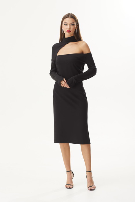 Платье прилегающего силуэта из трикотажного полотна. Воротник стойка. Застежка в среднем шве спинки на потайную молнию. Слева разрез 29см. Рукав длинный с отверстием для большого пальца. По переду вырез асимметричной формы с открытым левым плечом.