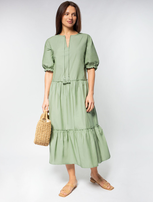 Платье с V-вырезом выполнено из легкого хлопкового поплина. Воздушная модель с пышной юбкой-воланами в стиле бохо отличный вариант для жаркой погоды. Натуральный состав ткани обладает высокой воздухопроницаемостью, а также способностью поглощать и отдавать влагу. В изделии будет очень комфортно, благодаря правильной регуляции температуры тела. Подходит для любой фигуры.