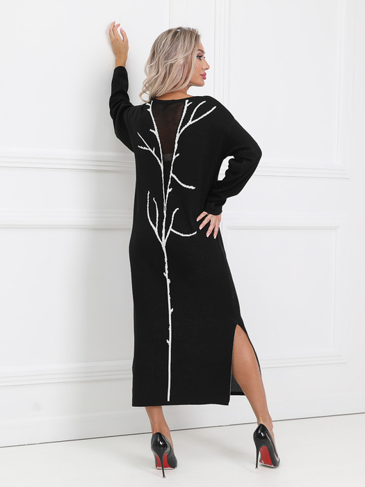 Стильное платье прямого силуэта. Платье выполнено из хлопковых нитей черного цвета с тонким плотным переплетением. Круглый вырез обработан подвязом. Платья дополнено вывязанным контрастным рисунком. Длина изделия по спинке от плечевого шва до низа изделия — 120 см.