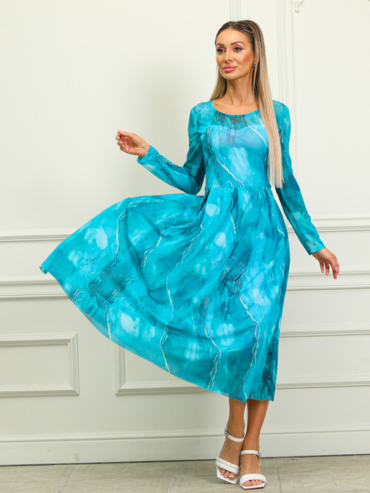 Очаровательное платье прилегающего силуэта из трикотажной сетки бирюзового цвета. Платье двойное, сетка на трикотажной основе. Круглый вырез изделия и втачные рукава обработаны окантовкой. Платье отрезное по линии талии, линия талии эффектно подчеркнута сборкой. Рост фотомодели — 170 см.