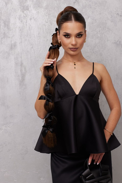 Блузка-топ на бретелях. Топ с отрезными чашками и поясом. Нижняя часть топа расширена. Длина 60 см.