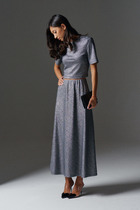 Стильная повседневная юбка А-силуэта. Верх юбки представлен кокеткой из джинсы , низ на сборке из хлопковой ткани. На кокетке по переду и спинке расположены талиевые вытачки. Кокетка прилегающего силуэта, от подрез книзу расширяется. По верху фигурный пояс с застежкой на петлю и пуговицу. На передних половинках обработаны наклонные карманы, застежка молния в среднем шве.