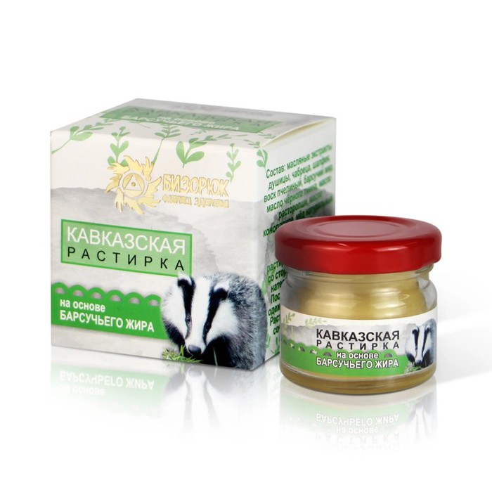 Состав: Барсучий жир, воск пчелиный, мед натуральный кавказский, масляные экстракты душицы, чабреца, лимонника, ежевики, мяты перечной, мяты луговой, камфора.