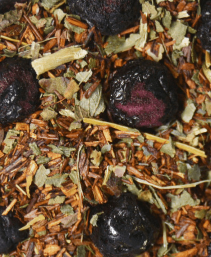 Купаж на основе африканского растения ройбос с добавлением сублимированной черники, листьев смородины. Содержит пищевые ароматические масла.