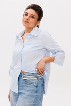 Рубашка свободного силуэта, с центральной бортовой застежкой по переду на петли пуговицы. Воротник отложной стойка. По переду на линии груди накладные карманы с клапанами. Спинка на кокетке. Рукав длинный на манжете.