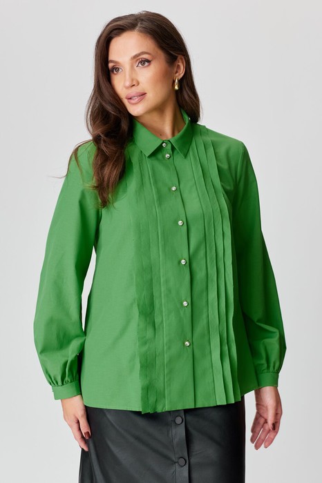 Блузка женская классическая прямого силуэта. Перед с вертикальными декоративными бейками, с застёжкой на петли и пуговицы. Рукав втачной одношовный со сборкой по низу, на притачном манжете. Воротник рубашечный на стойке.