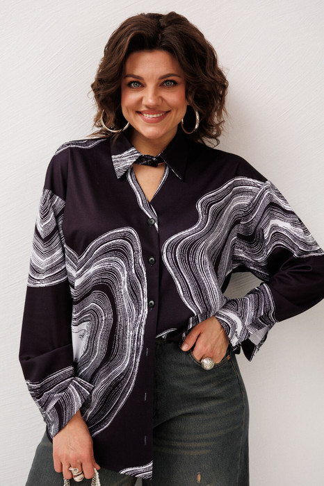 «Мраморная рубашка» от Анелли - это сочетание расслабленной элегантности и выразительного характера, которое делает образ особенным с первого взгляда. Прямой силуэт мягко ложится по фигуре, создавая ощущение свободы и уверенности, а отложной воротник на стойке добавляет утончённости и благородства. Спущенное плечо и длинные рукава на манжетах придают образу непринуждённую женственность, а фигурный низ делает силуэт интересным и современным.