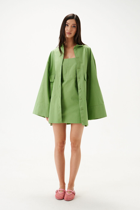 Рубашка прямого свободного кроя. Выполнена из хлопкового полотна.Воротник рубашечного типа отложной на стойке.Рукав втачной, со спущенной линией плеча, с манжетой по низу.На переде по линии талии накладные карманы с клапанами.В боковых швах разрезы.Застежка центральная пуговицы