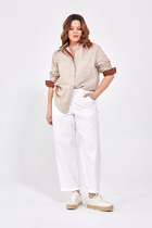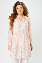 Блузка свободного кроя выполнена из текстильного полотна с абстрактным принтом . Характеристики: Блузка прямого свободного кроя, горловина стойка. Застежка центральная на петли пуговицы, рукав акцентный объёмный, крой рукава;летучая мышь; спинка отрезная с декоративной сборкой. Длина по спинке 80 см, длина рукава от горловины 76 см.