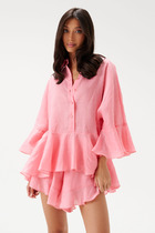 Рубашка прямого свободного кроя выполнена из текстильного полотная песочного цвета в розовую полоску. Характеристики: прямой свободный крой, отложной воротник на стойке, застежка центральная на петли пуговицы, по переду крупные карманы, рукав спущен, по рукаву декоративные складки, по низу рукава широкая манжета, спинка отрезная с декоративными складками, низ изделия с плавным срезом.Длина по спинке 80 см, длина рукава от края горловины 74 см.