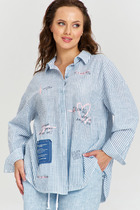 Рубашка прямого свободного кроя выполнена из хлопкового полотна голубого цвета. Характеристики: отложной воротник, застежка центральная на петли пуговицы, рукав расклешен - спущен, по низу рукава широкая манжета на пуговице, по переду нашиты карманы с клапоном, спинка отрезная с декоративной сборкой. Длина спинки 72 см, длина рукава от края горовины 76 см.
