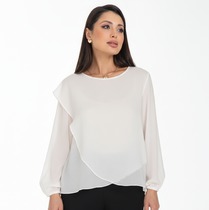 Рубашка свободного кроя, выполнена из хлопкового полотна белого цвета. Характеристики: отложной воротник с остроугольным лацканом, двубортная застежка на пуговицах, крой рукава «летучая мышь», по низу рукава пата с пуговицей, низ изделия на обтачке. Длина спинки 44 см, длина рукава от края горловины 82 см.
