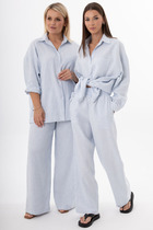 Рубашка из 100% хлопковой ткани в полоску, свободного силуэта, со спущенной линией плеча и длинным рукавом с манжетой. Застежка спереди на пуговицы. Спинка с глубокой встречной складкой. Воротник рубашечный. Изделие декорировано авторскими принтами и джинсовыми нашивками с необработанными срезами.