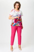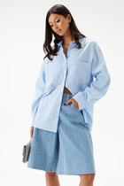 Блузка женская свободного покроя, удлиненная, с рубашечным рукавом на манжете по низу, по переду на уровне груди - накладной карман, застежка спереди на планку с пуговицами, воротник рубашечный на стойке, низ изделия фигурный, с закругленными разрезами по боковым швам.