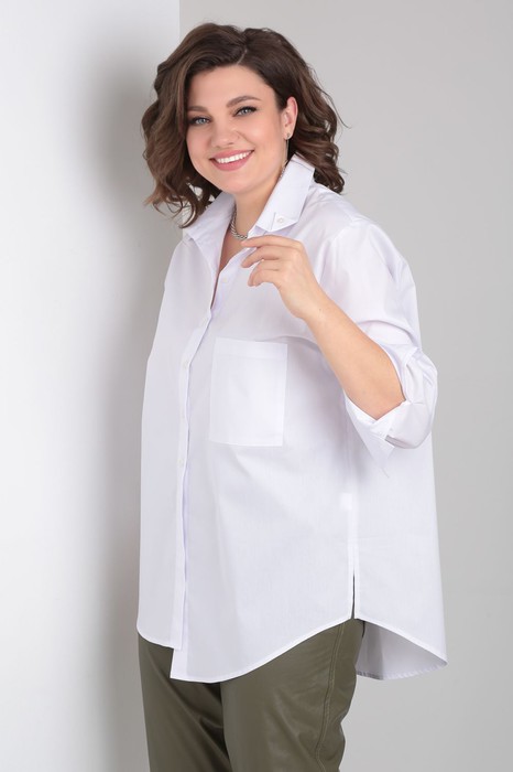Рубашка прямого силуэта подходит под любые формы и типы фигуры. Правая полочка короче левой, при этом вытягивая силуэт. На левой полочке расположен карман. По спинке имеется кокетка с пришивным декором. Эффектный образ создается за счет необычных деталей и элементов. Асимметричные манжеты и полочка фишка этой рубашки. Ведь любая асимметрия стройнит! Белая рубашка– это не только стильно, но и эффектно, а ещё и удобно. Прямой силуэт, который стройнит и белый цвет сочетается со всей палитрой одинаково классно. Добавляем эту рубашку к любому “низу” образ готов. Модель OverSize.