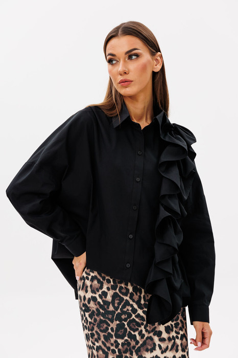 Блуза прямого свободного силуэта с рубашечным воротником на стойке и зауженным рукавом на манжете, со спущенной линией плеча. Акцентная фронтальная деталь: вертикально ассиметричная рюша. Сборка по центру рюши придает форму отделочной детали. Спереди на функциональной планке петли/пуговицы. Спинка изделия имеет горизонтальную плечевую кокетку и встречную складку для свободы облегания. По плечевому шву заложена складка. Низ блузона слегка фигурный: спинка и полочка чуть длиннее бокового шва. Длина изделия блузона по спинке 73,5 см. Рукав рубашечный одношовный,, завершается манжетой (высота 5 см) с застежкой петля/пуговица. Длина спущенного плечевого шва 33 см. Длина рукава с манжетой 41 см.