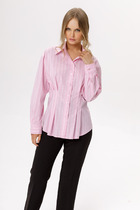 Блуза-рубашка со стояче отложным воротником и центральной застёжкой на петли и пуговицы. Перед с накладным карманом и декоративной деталью с застёжкой на пуговицу. Спинка с отрезной кокеткой и складкой от неё. Рукава втачные с манжетами по низу.