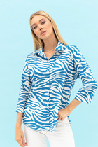 Рубашка прямого силуэта с фигурным низом. Выполнена застежка на петли и пуговицы. По горловине стояче-отложной воротник с отрезной стойкой. По спинке кокетка и склада на свободу движения. Рукав рубашечного кроя с манжетой по низу. К горловине стойке прикреплен дизайнерский цветок.
