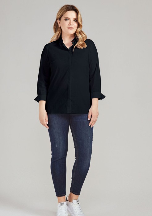 Стильная блузка из хлопковой ткани. В блузке сделан акцент на офисный стиль с нотками роскоши. Блузка полуприлегающего силуэта, с застежкой на потайную планку, с нагрудными вытачками по переду, на спинке кокетка, рукава удлиненные на манжете.