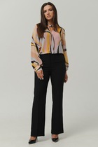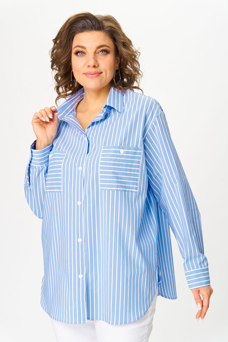 Блузка женская свободного силуэта выполнена из легкой хлопковой ткани. Горловина с отложным воротником на стойке. Застежка центральная на петли и пуговицы. Спереди в верхней части накладные карманы. Спинка с кокеткой и складкой из-под кокетки. Плечо спущенное, линия поймы углубленная. Рукава длинные на манжете, с застежкой на петлю и пуговицу. Линия низа блузки фигурная.
