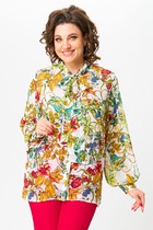 Блузка женская из рубашечной ткани, для повседневной носки, прямого силуэта с центральной застежкой на петли пуговицы. На стойке и манжетах рукава золотистые кнопки. По окату и низу рукава легкая сборка. На верхние три пуговицы пристегиваются декоративные накладки в виде цветков.