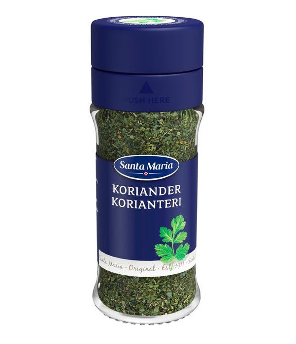 Santa Maria Кориандр лист 10г Ингредиенты: Лист кориандра. Пищевая ценность на 100 г Энергия 1342 кДж/318 ккал Жиры 4,8 г из них насыщенные 0,1 г Углеводы 42 г из них сахара 7,3 г Пищевые волокна 10 г Белок 22 г Соль 0,53 г