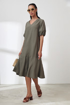 На лифе небольшие защипы и завязка-пояс . Низ рукава собран на резинку.